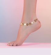 Destaca tu estilo con la delicada Tobillera de Flor Dorada: joyería fina bañada en oro, ajustable y antialérgica, ideal para realzar tus looks veraniegos.
